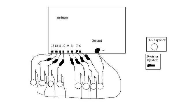 Mi Arduino es un Duemilanove que tiene una resistencia en el pin 13. No estoy seguro acerca de diferentes modelos, pero para estar seguro me gustaría añadir uno de todos modos. A continuación, conecte un resistor de 100 ohm a cada ánodo (que es la pata más larga) de cada LED y para la pierna más corta, va a la tierra de tu Arduino.