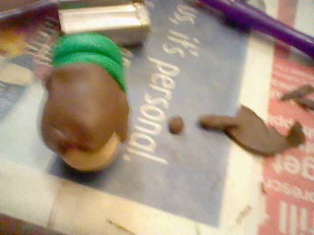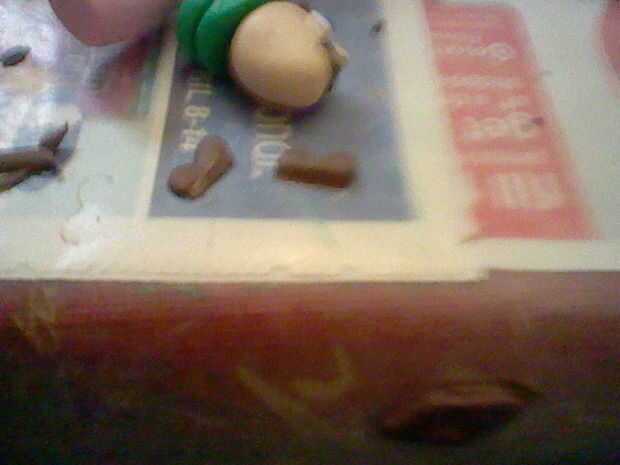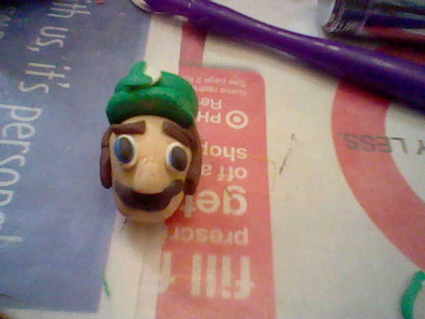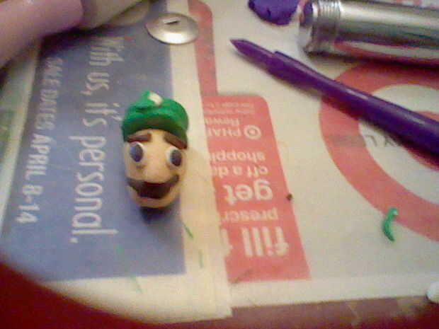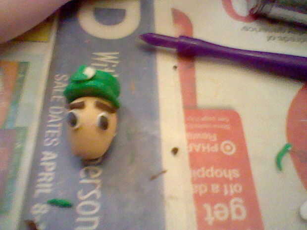 Take some skin colored clay. Rodillo en forma de la cabeza. Coloque el sombrero en la cabeza. Ahora toma algunas arcilla blanca, rodar en un óvalo y aplanarla. Hacer lo mismo con el azul y negro, excepto el azul más pequeño que el blanco y el negro más pequeño que el azul. Ahora pegan su azul sobre el blanco y pegar tu negro en el azul. Hacer uno más de estos y luego pegarlo en la cabeza de Luigi. Tomar algunos arcilla marrón. Hacerla en dos rectángulos para las cejas. Pegar sobre los ojos. Ahora tome algunos piel coloreada arcilla. Hacerlo en una forma de la nariz. Ahora lo pegan debajo de los ojos. Tomar algunos barro negro para el bigote. Utilicé un cortador de galletas para hacer esto. Ahora pégalo debajo de la nariz. Ahora tomar algunas arcilla marrón para el pelo. Utiliza un cortador de galletas otra vez para el pelo de lado. Tomar algunos arcilla más marrón y pegar en la parte posterior de su cabeza. Tomar algo más de piel coloreada arcilla y rodar en una lata para el cuello. Pegarlo por debajo de su cabeza.
