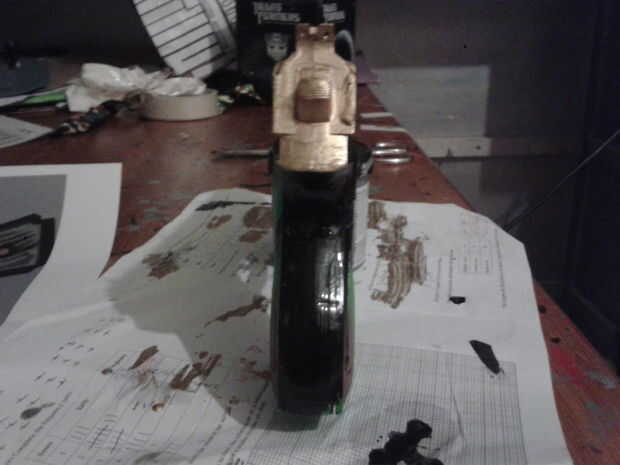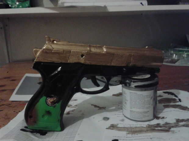 Lo mismo con el negro como lo hizo con el oro, pero a lo largo de la frontera de oro/negro, use un bastoncillo de algodón cuidadosamente entrar en zonas estrechas de la pistola. Volver a utilizar un bastoncillo de algodón para pintar el negro de lugares de interés, ser más prudente hacerlo.