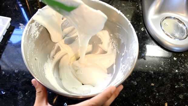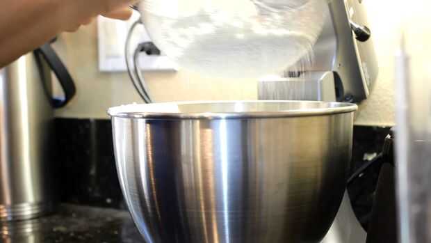 Ahora, Tamice los ingredientes secos en el tazón de la batidora y doblar cuidadosamente la mezcla de sal/azúcar/almendra en la espuma de huevo/azúcar. Al final, la mezcla debe ser suave, pero conservan una textura fundida. Debe de la cinta, pero no debe llenar nuevamente la forma de la taza inmediatamente (para una mejor presentación visual, ver video). Metiendo la masa la consistencia adecuada puede ser la diferencia entre plano de pies menos macarons, macarons Rajada hinchada o macarons perfecta. Pliegues un par de puede destruyen sus cookies. Así, doblar con cuidado.