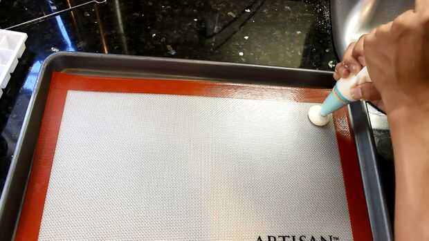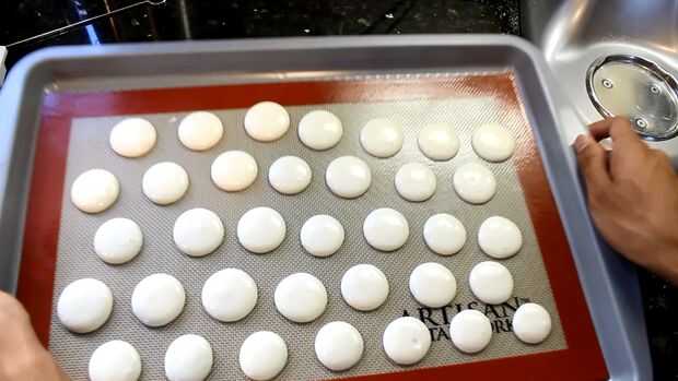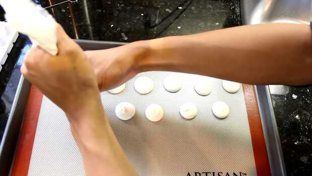 Llene la mezcla en una manga pastelera con punta redonda grande y tubo en montículos de cuarto tamaño en piezas de papel o silicona de pergamino. Luego, toque la bandeja para hornear en un contador de 10 - 20 veces para eliminar el exceso de aire y para aplanar los macarons en el deseado disco como forma. Ahora aquí está el paso más importante de macaron que (suponiendo una tasa de cada paso con grados relativos de importancia. En la actualidad, cada paso es igualmente importante, porque lograr cada paso puede ocasionar desastres. Solo para reflexionar.) Permiten sus macarons para sentarse tranquilo durante al menos 30 minutos. Esto permite los macarons a "shell", o crear una piel endurecida sobre la superficie, evitando grietas en el horno. Asegúrese de que sus macarons están secas al tacto y no agrietarse al entrar en contacto antes de colocarlos en el horno. Si es necesario, use un ventilador para acelerar el proceso de secado.