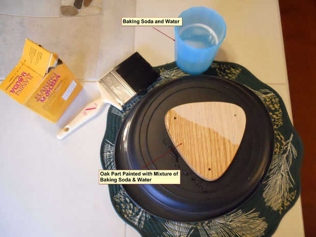 La imagen de arriba muestra la parte roble como se verá cuando primero se aplica la solución de agua y soda para hornear.