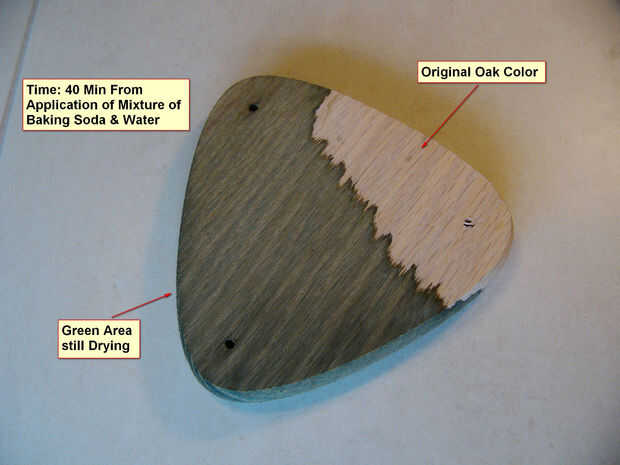 En esta imagen, el área de la madera de roble fue pintado con el bicarbonato de sodio y agua mezcla de ahora muy verde en color. El área de la parte de roble que no fue pintado con la mezcla puede verse todavía se enciende color marrón.