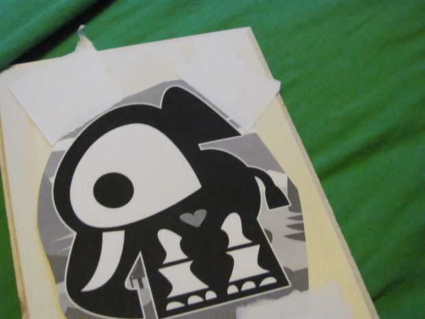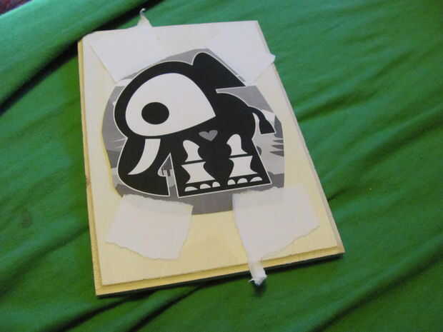 Corte alrededor de la porción de la imagen que desea utilizar en la muestra, a continuación, cinta en la madera donde usted quiere que vaya.  No pude encontrar ninguna cinta scotch esta vez, usé algunos lefter sobre hojas de pegatina que íbamos a tirar.