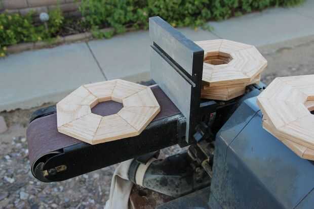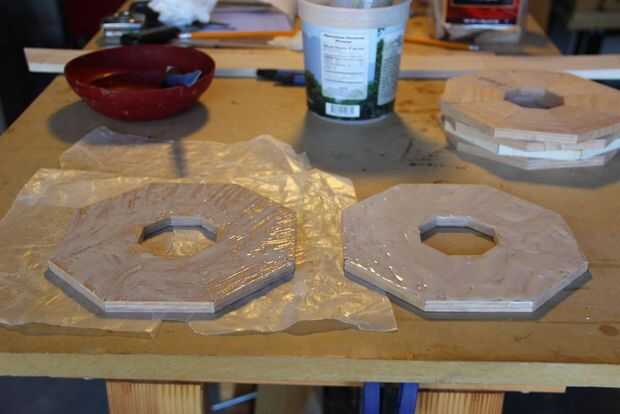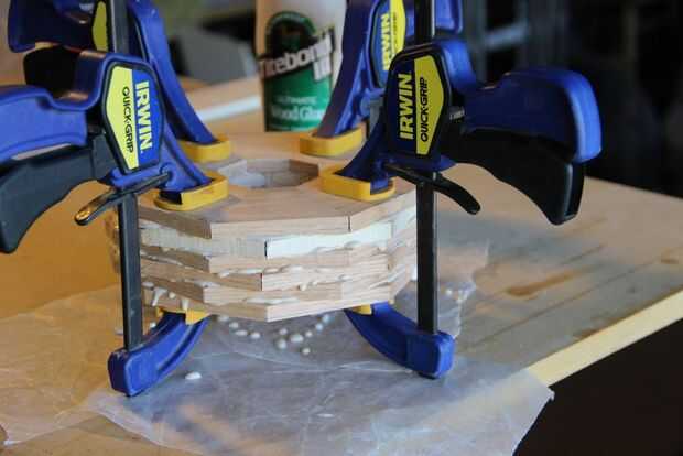 La pila y unir las capas de octágono preparado en el paso anterior. Apilar, asegúrese de que compensar las uniones a tope de capa a capa para hacer una muralla fuerte para el tazón de fuente. Girar cada octágono una superposición media, pero podría crear más de un patrón de 'espiral' con menos de una vuelta. Cada anillo octagonal añade 3/8" a la altura del lado del tazón de fuente. Seis capas de hacen un bonito borde 2-1/4" de 5" a 7" recipiente de diámetro. Asegúrese de que su pila es razonablemente recta y no se ve como la "torre inclinada de Pisa".