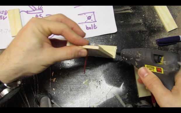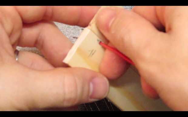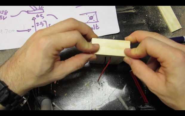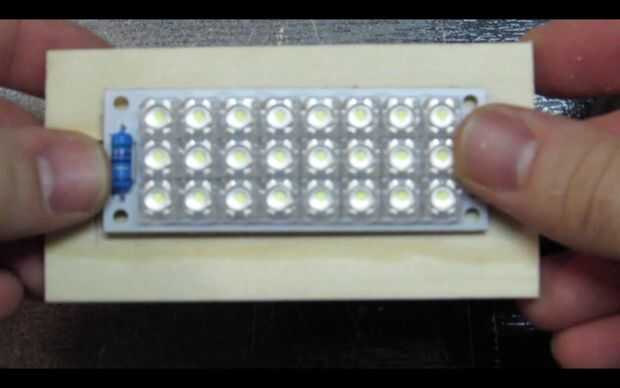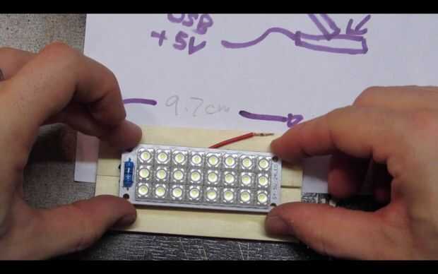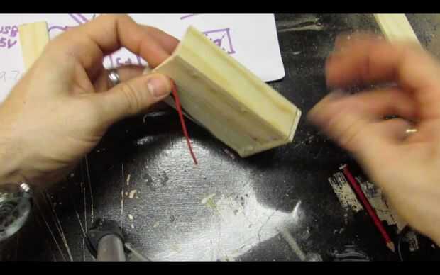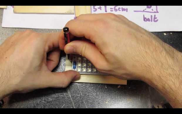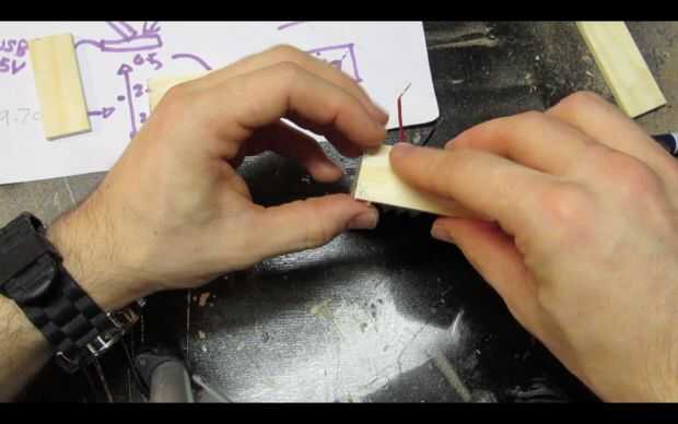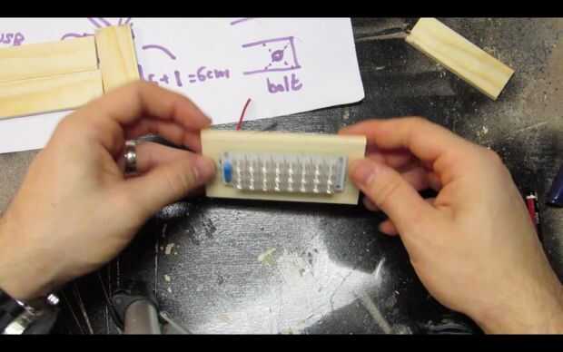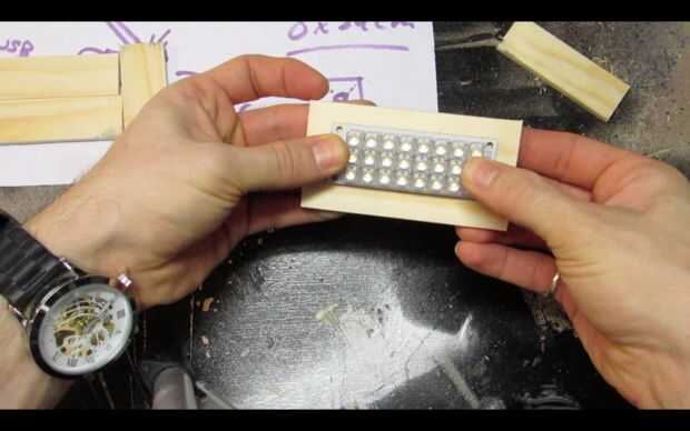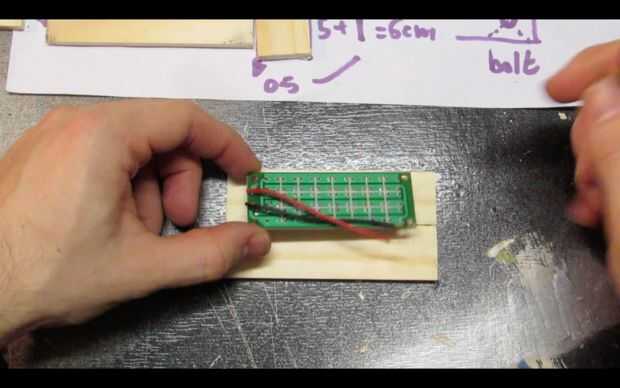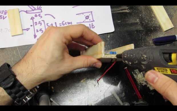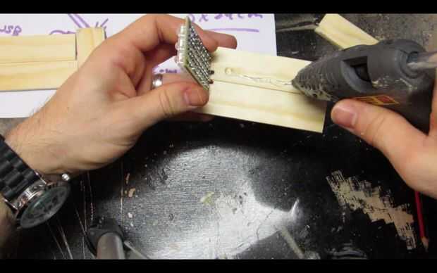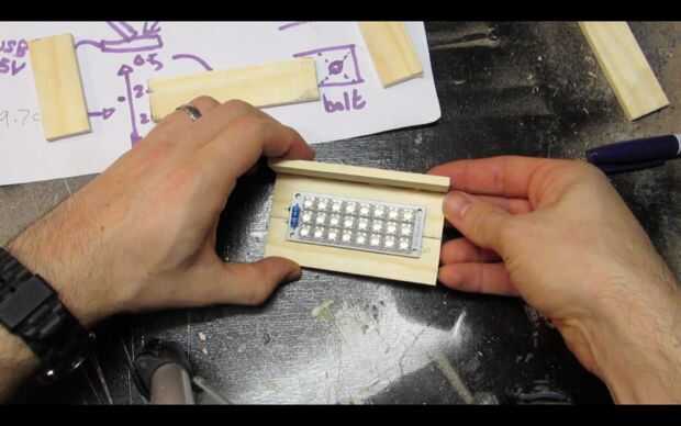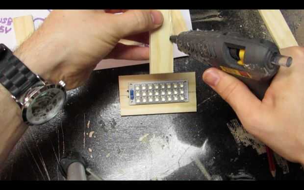 Pase los cables por los agujeros y utilice pegamento caliente para fijar el tablero del LED a la pieza de madera.