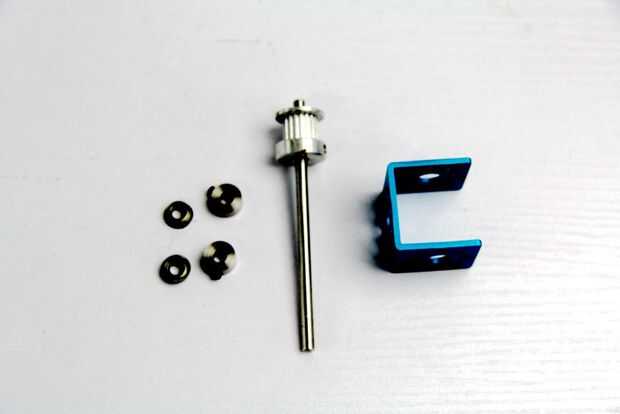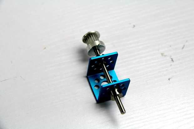 3. montar la "rueda de oración". En primer lugar, fijar la polea de sincronismo 18T con tornillo sin cabeza M3 en el eje de 80mm. Cuando este terminado, el orden de las partes debe ser tiempo bulley 18T -> eje cuello - > -> cojinete de brida soporte U1 - > cojinete de brida -> collar de eje.
