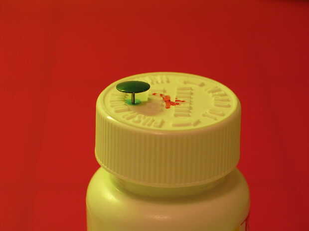Sólo podría poner la chincheta en la mesa con la punta hacia arriba. Voltee la botella y empuje hacia abajo en la virada. Si la presión no es ni siquiera, es fácil doblar la chincheta. Para mantener la presión, incluso utilizar tres chinchetas. Espacio les uniformemente alrededor del borde y empuje la botella hacia abajo sobre ellos. Incluso si va sola, es suficiente para bloquear las tapas.