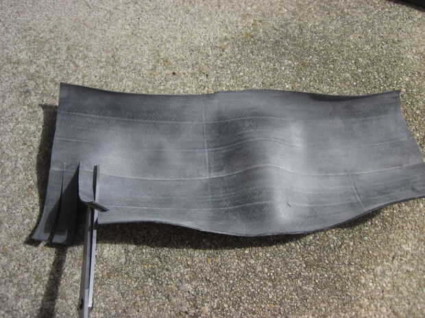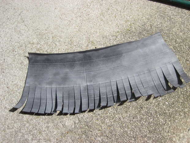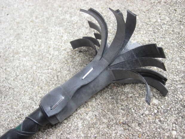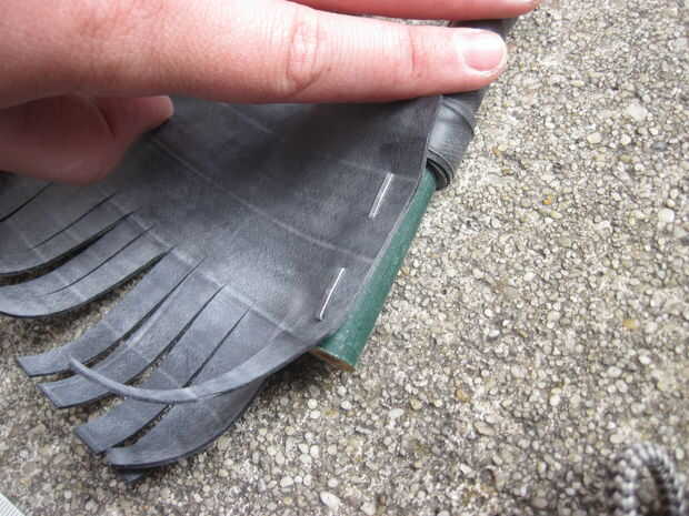 Preparar las borlas por medio de las tiras de corte en los pedazos más grandes de goma como se muestra en la foto. Son las tiras más allí y cuanto más gruesa la goma utilizada para esta parte, se producirá la resistencia del aire más y más lento el palo girará (use hule grueso y cortar tiras delgadas para principiantes, liviana goma y tiras más gruesas para un giro más rápido. Los profesionales tienden a usar palillos con sin borlas, y termina a menudo un palo de lanzando que se afila a un punto estrecho en el medio con más grueso, que girar muy rápido).