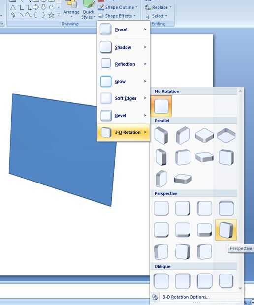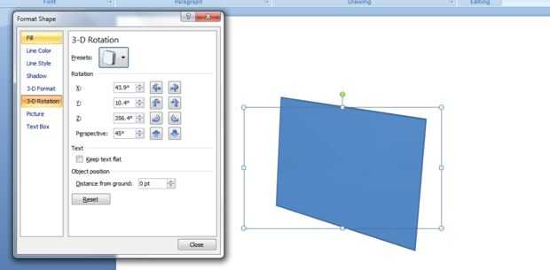 Inicio > dibujo > efectos de la forma > rotación 3d > 3d opciones de rotación...