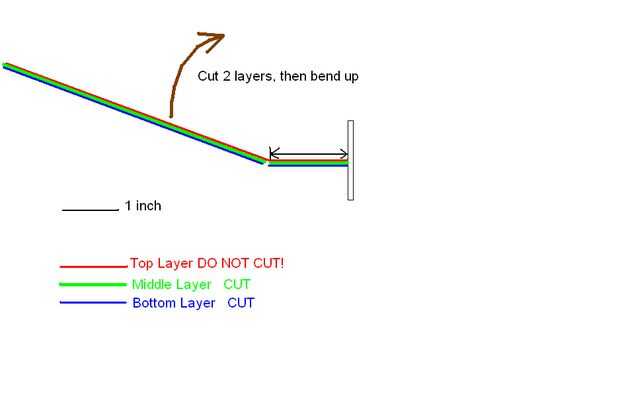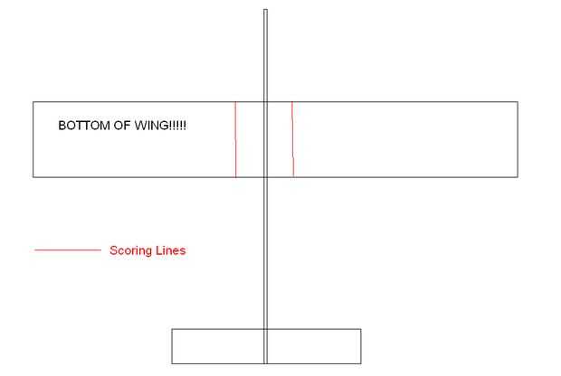 Eso es él. Ahora a aplicarlo. Dibuje dos líneas en la parte inferior del ala, ambos 1 pulgada desde el fuselaje (si el avión tiene una envergadura de menos de 20 pulgadas, dibujar las líneas de media pulgada del fuselage), como se muestra en foto 1. Si usas cartulina, corte dos capas como se muestra en foto 1 y doble el ala hacia arriba. Si está utilizando espuma de poliestireno, hacer lo mismo, como la mayoría de la espuma de poliestireno se compone de tres capas.