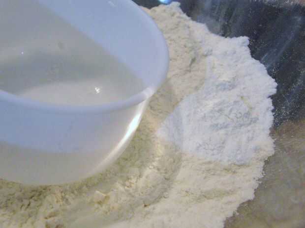 Luego, en otro bol, añadir la harina y la sal juntos. Utilice el accesorio de gancho de masa en la batidora. Añadir los ingredientes húmedos y comenzar batiendo a velocidad media hasta que la masa salga juntos.