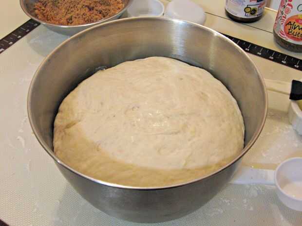 Usar mantequilla derretida y cubrir el fondo y los lados del tazón de fuente grande. Coloque la bola de masa en el recipiente y cubrir la parte superior con mantequilla derretida. Cubra el tazón con una toalla de papel húmeda y ponerlo en un lugar un poco caliente por 1.5 horas.