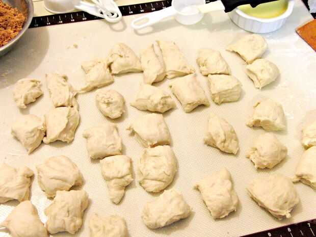Después de que la masa se hace aumento, saque la masa sobre una superficie enharinada. Estirar la masa en un cuadrado y cortar en trozos (yo hice una de 8 por 8 en los cuadrados que corté en trozos de 64).