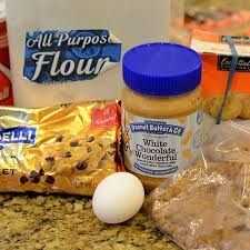 Usted necesita cuchara, licuadora, tazón, mantequilla de maní, azúcar, 1 huevo, azúcar morena y chips de chocolate, taza de medir de tamaño 1.