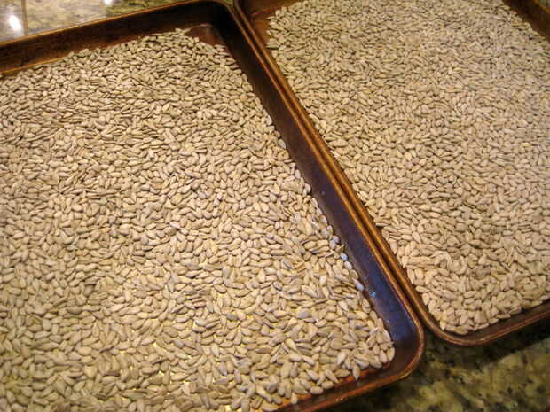 Precalentar el horno a 350F. Repartir las semillas de girasol en dos hojas para hornear.