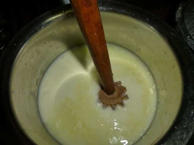 • Usando al churner mantequilla, batir la cuajada en un movimiento circular en ambos sentidos con las palmas de las manos como se ve en el video en el paso 3.