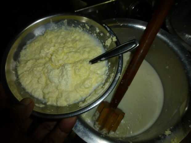 • Sacar la mantequilla con una cuchara y guardar en un recipiente separado. Esto puede incluir un poco de suero de leche, pero no hay nada que preocuparse por como haremos mantequilla limpia pronto.