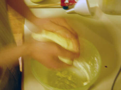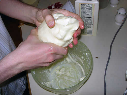 Ahora es el momento para un paso que no se menciona a menudo en crónicas de mantequilla elaboración: lavar la mantequilla. Todavía hay sólidos de la leche en la mantequilla que no en el suero de leche, y por lo tanto es de vital importancia lavar la mantequilla si desea mantener más de un día, incluso en el refrigerador. Para ello, amasar la mantequilla hasta que salga todo el líquido, luego ejecutarlo bajo un grifo y amasándola y continuar hasta que el líquido salga claro.