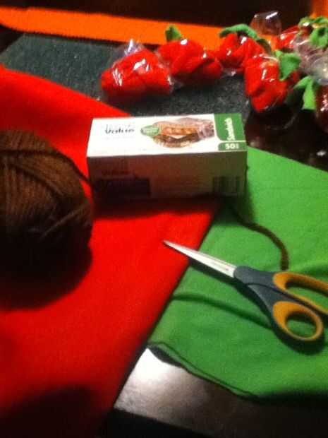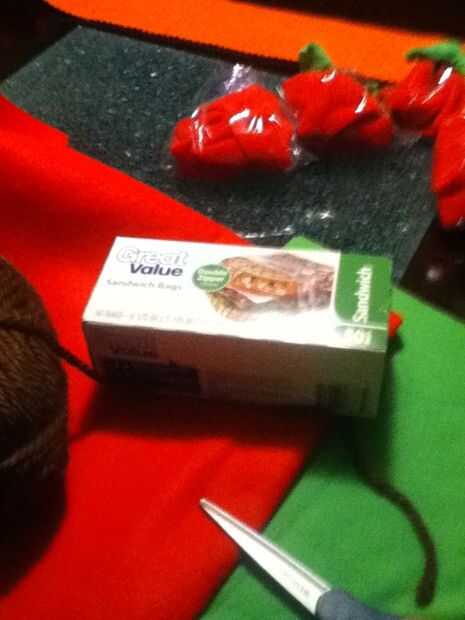 lo que usted necesita bolsas de sándwich de tela roja y verde marrón hilo y tijeras.