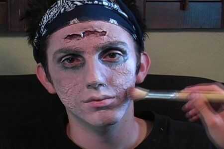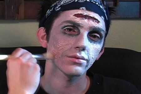 Hemos casi terminado. El pasado algunas capas de maquillaje son de mezcla hasta que se ve bien. Comencé con un color base que era un poco más rojo tono de carne entonces regular, pero realmente siento zombis vienen en todas formas, tamaños y colores. Después el color base comencé poco a poco añadiendo más colores, hasta que "parecía bruto". Una buena regla (que yo aquí) es para iniciar con el color y el movimiento más oscuro más claro. Echa un vistazo a las fotos para tener una idea de lo que hacía.