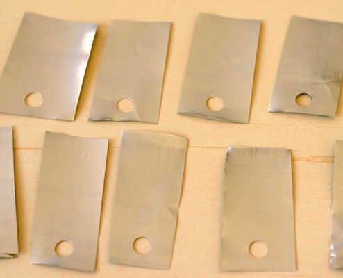Corte el aluminio puede en pequeñas tiras con las tijeras. El metal es muy fino y fácil de cortar aunque un poco torpe debido a la forma redonda de la lata. Puede hacer etiquetas de 18-20 de uno puede si mantenerlos bastante pequeña. Después de cortar todas las piezas utilizar la perforadora para hacer un agujero cerca de un borde.