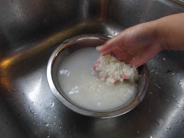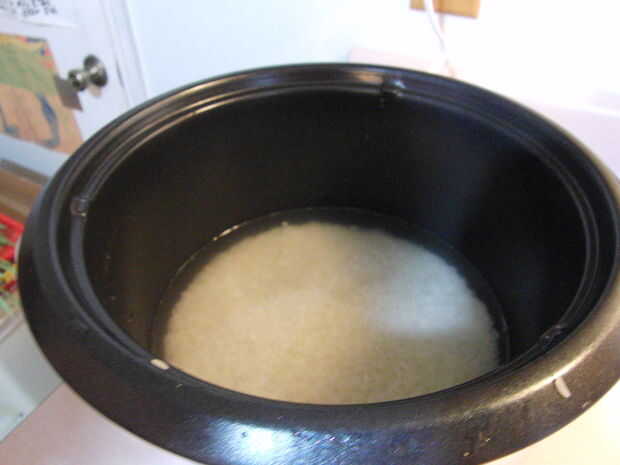 Vierta el arroz en un recipiente aparte y añadir agua (esta no necesita ser medido ya que es para lavar el arroz solo. Revuelva el arroz alrededor varias veces y verter el agua. Repita 2 veces más. Después, añadir las 2 tazas de agua para el arroz lavado y vierta la mezcla en la olla arrocera. Generalmente tarda unos 30 minutos para el arroz a cocinar.