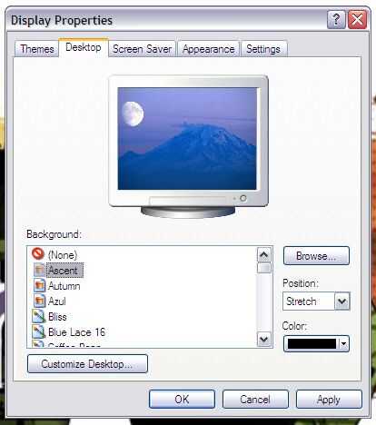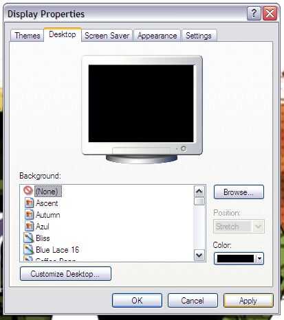 Quitar el papel pintado puede ayudar a aumento a veces, en marcha y ayudar a los programas de carga más rápido, especialmente en equipos antiguos. Para ello, haga clic derecho en el escritorio, ir a propiedades, ir a fondo y haga clic en ninguno, a continuación, haga clic en aplicar.
