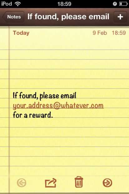 No es una buena idea para usar su nombre real y dirección, así que en su lugar, utilice una dirección de correo electrónico simple o un número de teléfono no te importa ser compartido entre extraños. Escriba unas líneas abajo de la pantalla, para que termina claramente visible en la pantalla de "Bloqueo".