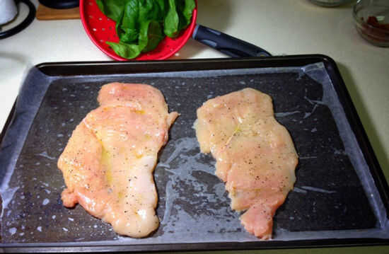 2. Colocar la pechuga de pollo en la hoja y cepillo unas gotas de aceite sobre él y temporada en ambos lados.