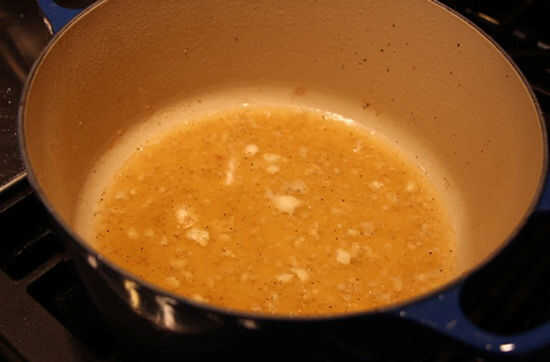 8. Añadir zumo de limón, el caldo y el vino a una sartén y llevar a ebullición y cocer durante 5 minutos.