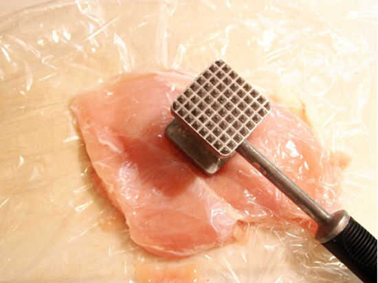 Para libra el pollo, colocar la carne entre la envoltura de plástico y el trabajo desde el centro hacia afuera.