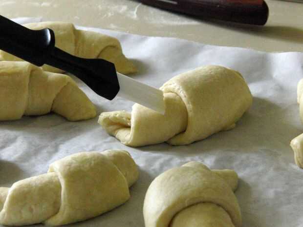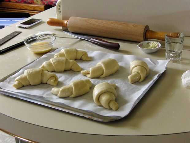 Después de esperar, precalentar el horno a 375 grados Fahrenheit. Combinar 1 huevo con una cucharada de leche para formar una colada del huevo y los croissants de la prueba del cepillo.