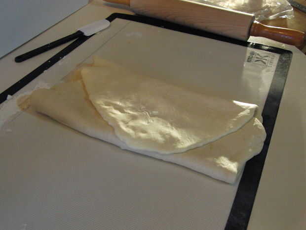 Estás listo para comenzar la segunda vuelta. Estirar la masa en el rectángulo de 9 x 18 pulgadas. Repita el proceso en el último paso (lo que el rectángulo, doblar en los tercios con la parte superior e inferior). Después de que haya terminado, utilice sus dedos para hacer dos marcas sobre la masa de las dos vueltas que han hecho.