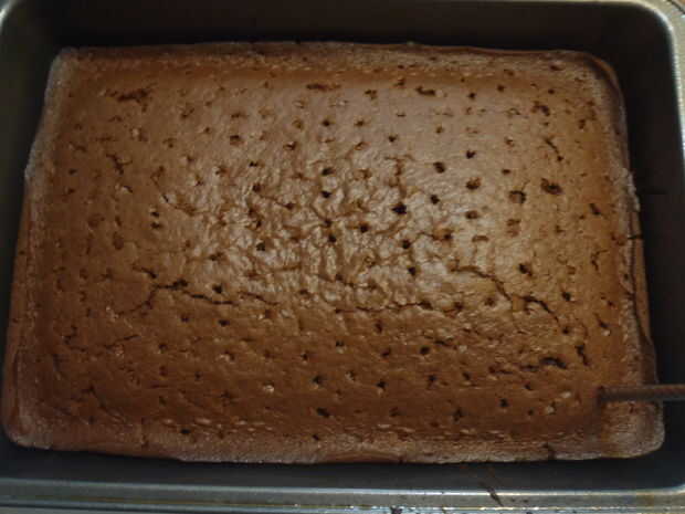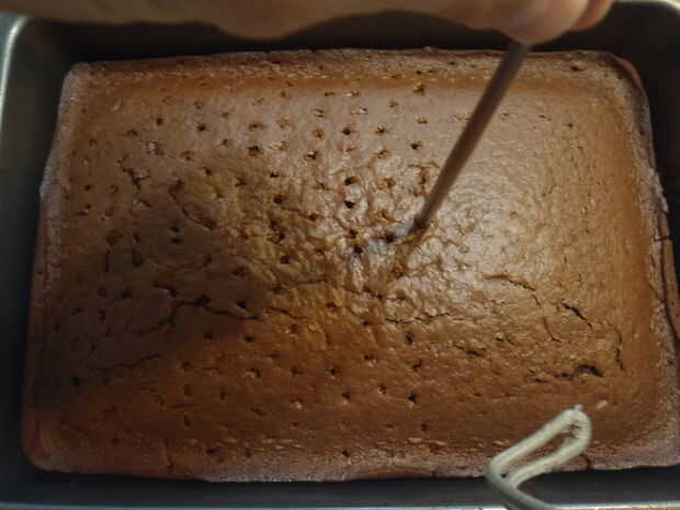 Tomar un palillo, paja u otro utensilio de similar tamaño y forma y empujar los agujeros en el pastel les espaciado aproximadamente 1/2 pulgada de distancia. Asegúrese de que cualquier utensilio que usas para hacer los agujeros deja un agujero lo suficientemente grande como que la leche condensada en los agujeros. He encontrado un plástico paja funciona mejor o un utensilio que es 1/4 de pulgada de diámetro.