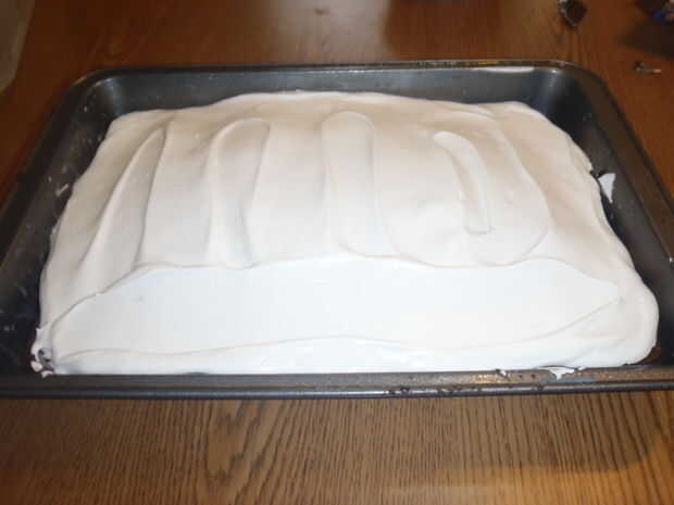 Propagación batida topping sobre el pastel con una espátula haciendo que la capa 1/2 una pulgada de espesor. Puede utilizarse batida más o menos a gusto personal. Asegúrese de que la batida es completamente descongelado, de lo contrario extenderla sobre la tarta será un trabajo difícil y sucio.