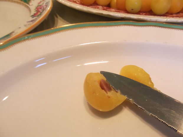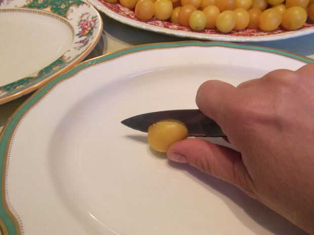 Corte las ciruelas por la mitad y sacar la piedra.