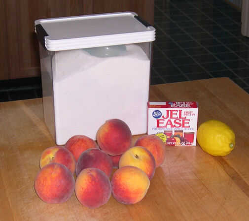 Necesita alrededor de dos libras de melocotones maduros frescos, limón, azúcar y una caja de pectina en polvo (gelatina seguro, Jel facilidad.) Si las cantidades dadas en el cuadro de pectina son diferentes de lo que se da aquí, ir con las indicaciones en la caja. Diferentes marcas pueden tener diferentes cantidades de pectina. Pectina