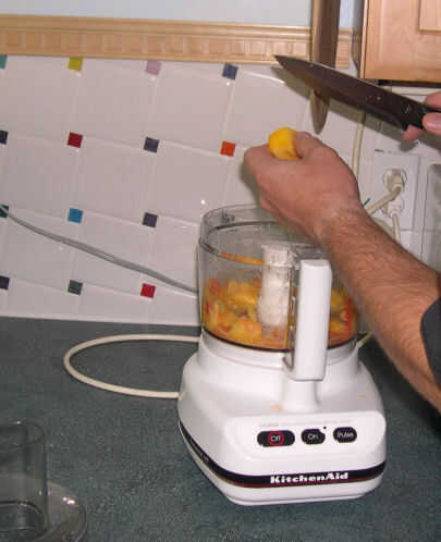 Pozo y pelar los melocotones. (Para la mermelada de fresa, lavar y las bayas del casco) Una manera fácil de pelar, con poco desperdicio, es colocar el melocotón en agua hirviendo durante un minuto aproximadamente, luego retirar y sumergir en agua con hielo. La cáscara se resbale fácilmente. Después de pelar, cortar la fruta del hoyo. Estas son melocotones 'aferrarse' por lo que el hoyo no soltará fácilmente. Por cierto, una trituradora de la patata va a hacer un buen trabajo si no tienes un procesador de alimentos.
