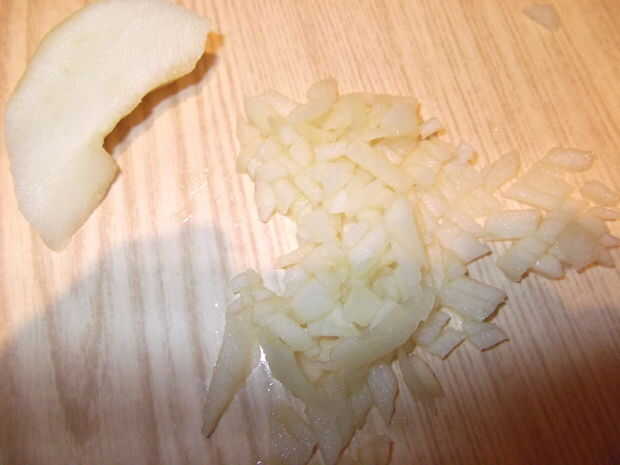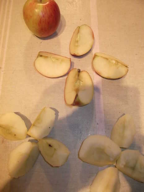 Una vez han quitado el corazón y pelada y quatered todas las manzanas, la etapa 2 está recibiendo todos los cuartos de manzana finamente en rodajas, luego en finamente en cubos. Creo que 1 x 1 mm!