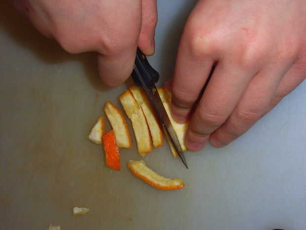 Una vez que tenga su piel, la rebanada del grosor que prefiera. No tienes que usar todo, aunque aun si decide no incluirlo en la mermelada final, cocinar todo, como thi desperdicios dará una mejor profundidad de sabor de los aceites en la piel.