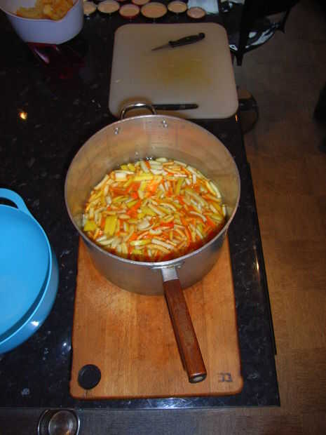 Una vez contenida, Añadir 500ml (o simplemente bajo una pinta) de agua y llevar a ebullición. La mezcla entera entonces se hierve para entre 45 minutos a una hora, en que la piel sea suave y translúcida. De vez en cuando, exprimir la pulpa con cuidado en el bolso (con una cuchara de madera) para liberar la pectina en la mezcla.