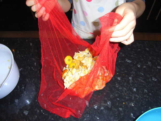 Para evitar que la pulpa en, necesita contener en una bolsa de malla. Aquí se utiliza un paño de malla, doblado y asegurado con una abrazadera plástica. Usted puede obtener bolsas de malla en la elaboración de la cerveza y tiendas de cocina.