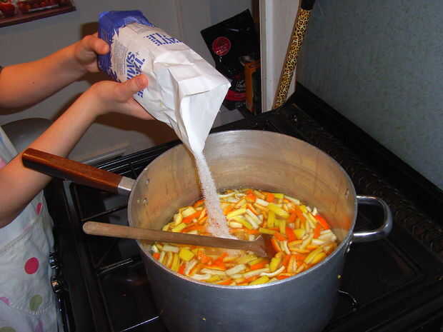 En este punto añadir 1Kg de azúcar blanco normal. Si quieres el mejor sabor naranja, no utilice caña sin refinar, demerara o panela como éstos tienen un sabor demasiado fuerte y pueden dominar a la naranja. Por supuesto si te gusta más caramelly, puede Agregar azúcares más sabrosas, pero prefiero anaranjado.
