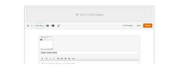 Hacemos clic en añadir de paso, se nos desplegará una pantalla como se muestra en la segunda imagen. Agregamos un título, una descripción a este paso y arrastramos las imágenes correspondientes al mismo.