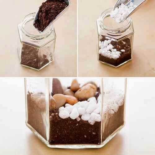 Preparar un tarro de cristal, poner suelo de nutrición interior a la altura de 4-5cm.