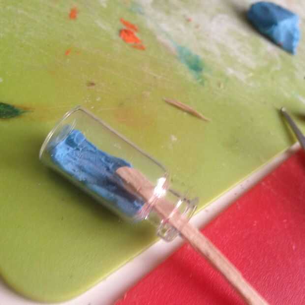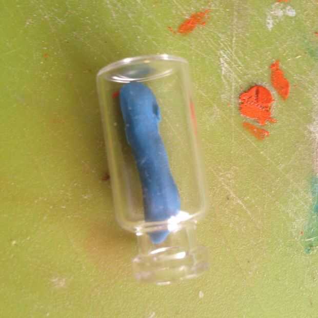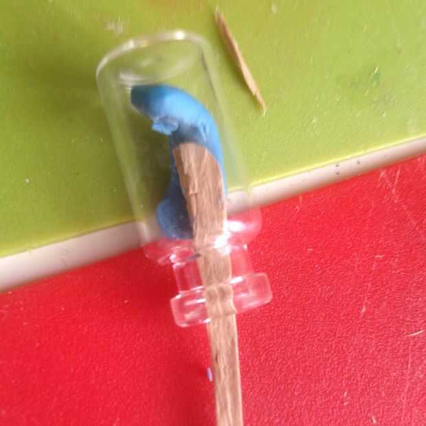 Luego lo shove en el contenedor, como se muestra arriba. Para aplanar hacia fuera, tenemos que una herramienta. Tomar un palo de polo y cortar formando un club de golf (como antes, ver arriba). Se utiliza para halagar a la plastilina. Utilizar la mayor parte de la herramienta de carnero en las esquinas cerca del cuello del botella encanto.