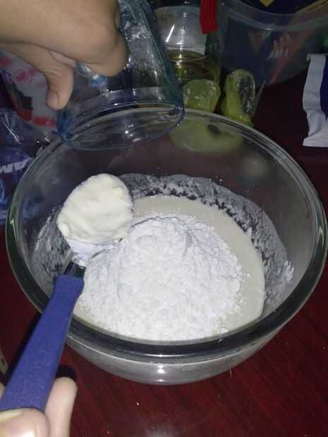 Mezcla todos los ingredientes en el vaso, luego poner otra taza de harina y mezclar otra vez.