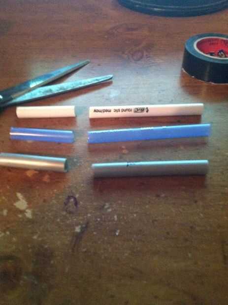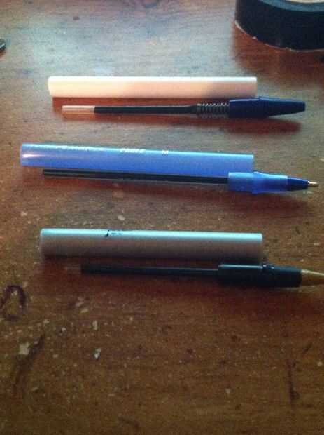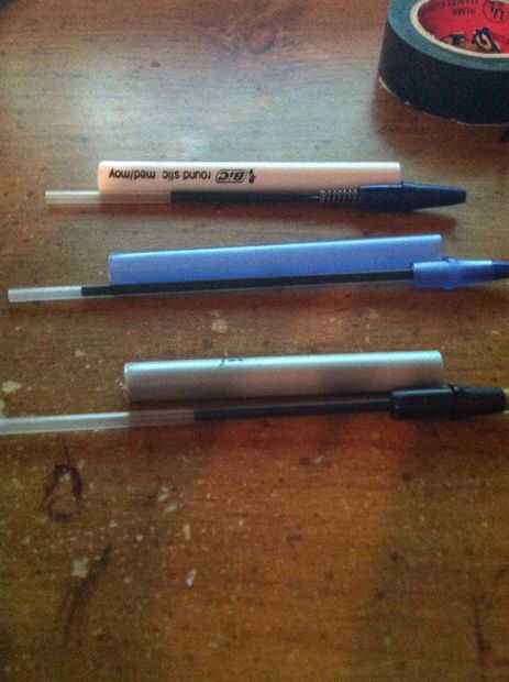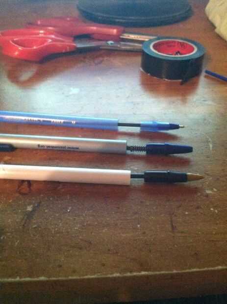 3) toma tus tijeras y corta hasta la longitud que desee. Luego pone el eje de la tinta al lado del cañón corte y corte un poco más corto que la longitud del barril (si es necesario pone un pedazo de cinta adhesiva sobre el extremo cortado del árbol de tinta para que la tinta no sale).