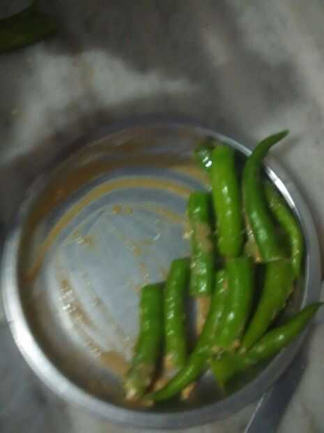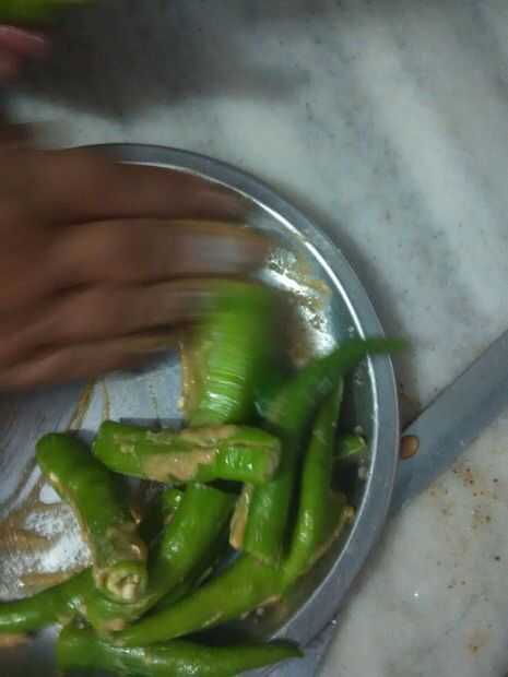e) ahora abre la rendija de una guindilla y añadir el relleno con los dedos. Esparcir uniformemente dentro de los chiles.